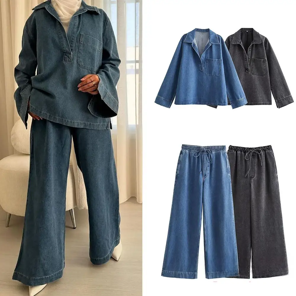 콘달라 빈티지 캐주얼 데님 시크 여성 정장 V넥 긴팔 상의+엘라스틱 스트레이트 팬츠 패션 2025 가을 스트릿웨어 세트