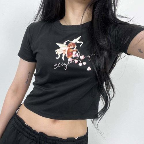 [셀럽하우스]당출 HCZT9335 큐피트 엔젤 프린팅 반팔 크롭 티셔츠 (2color)