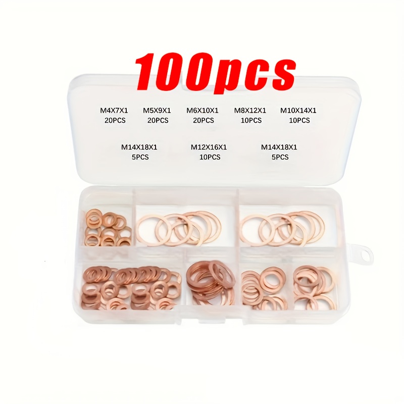 TEMU 100개 구리 와셔 세트 | 구리 밀봉 와셔 | O-링 솔리드 개스킷 모음 키트 | 자동차 엔진 오일 개스킷 스몸, 너트 및 볼트용 플랫 링 씰 모음 키트 (상자 포함)