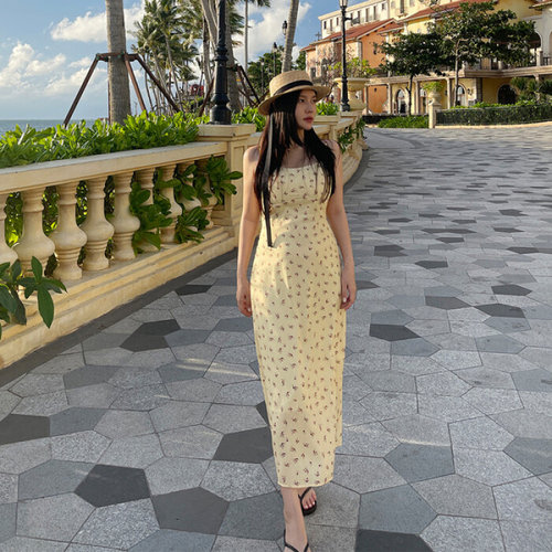글램핏 / 휴양지 해외여행 룩 러블리 플라워 패턴 옐로우 끈나시 슬림 롱 원피스