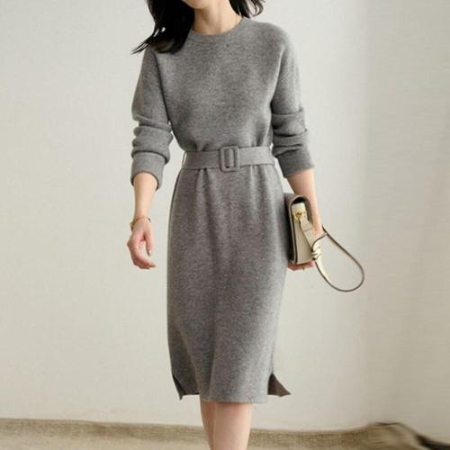 여성 반폴라 라운드 니트 원피스 미디 무릎 덮는 니트 롱 원피스