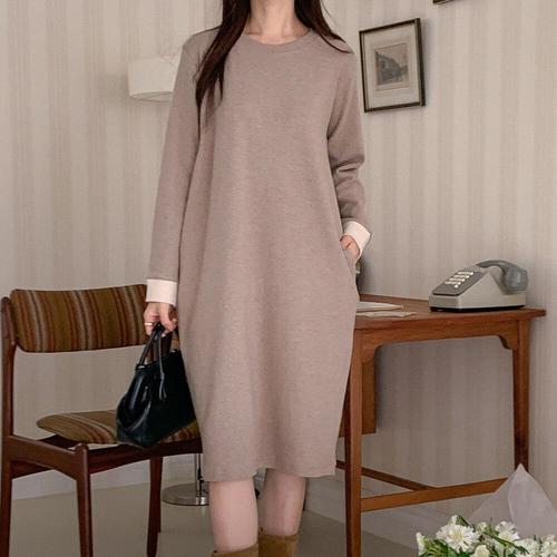 [신상오픈런]여성 배색 엘보 패치 루즈핏 포켓 등원용 미디 드레스