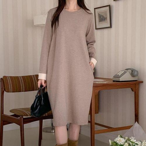 [미라클세븐]여성 배색 엘보 패치 루즈핏 포켓 등원용 미디 드레스