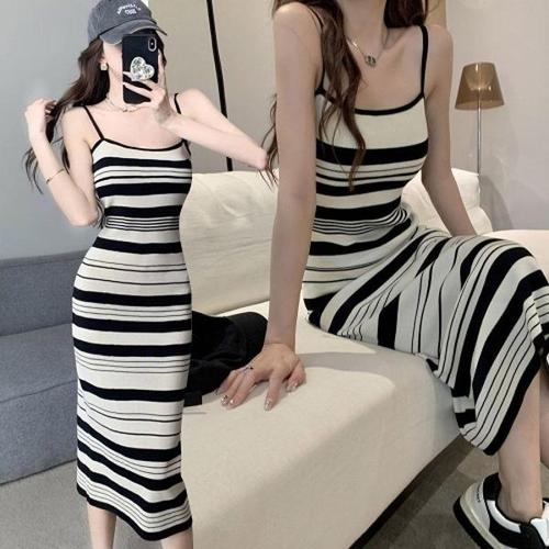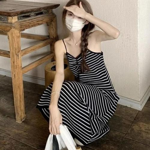 여성 민소매 니트 스트라이프 라운드넥 슬림핏 휴양지 원피스