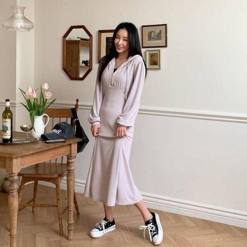 [옷자락] 여자 여름 이지룩 캐주얼 단가라 후드 니트 롱원피스
