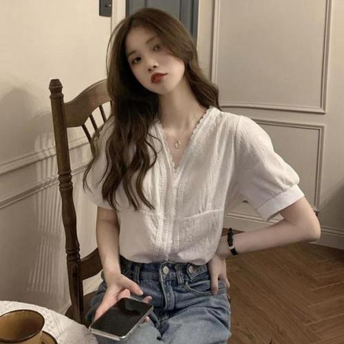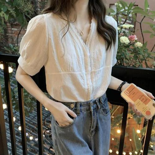 여성 여름 브이넥 레이스 포인트 진주 단추 블라우스 Acq2+9Qox