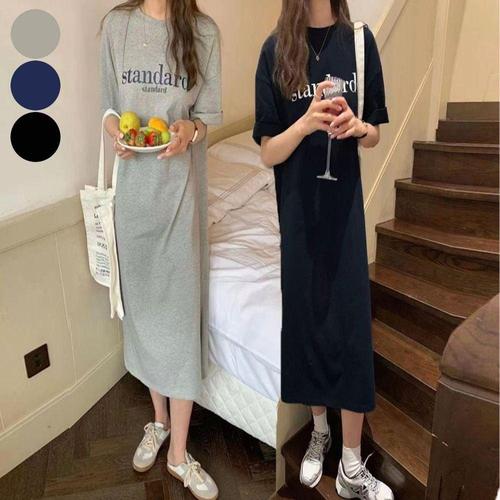원피스 반팔 데일리 레터링 여자 여름 롱 포인트 면 WFLQ83E