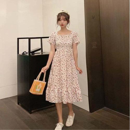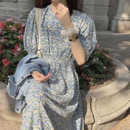 [셀러허브_여성트랜드패션]여자 스퀘어넥 퍼프 소매 셔링 여름 롱 플라워 원피스