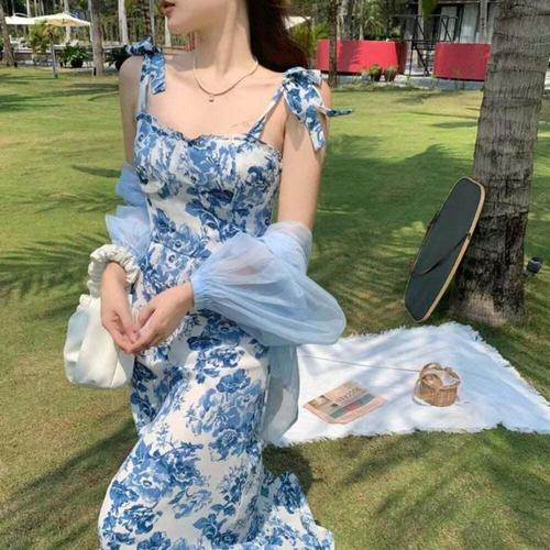 [셀러허브_여성트랜드패션]바닷가 원피스 여름 롱 민소매 휴양지 플라워 슬림핏