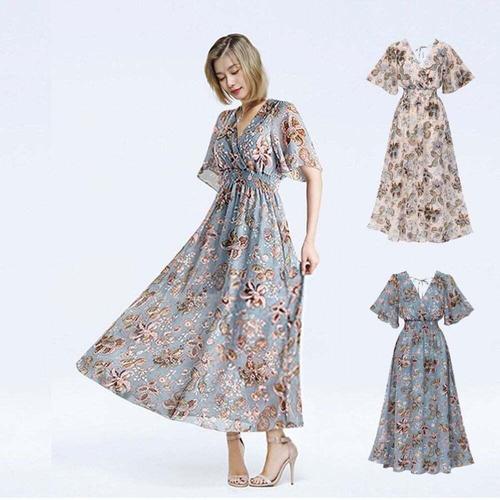 [에이치플러스몰]여름용 여성용 플라워 쉬폰 롱 드레스 반팔 슬림핏 꽃무늬 원피스