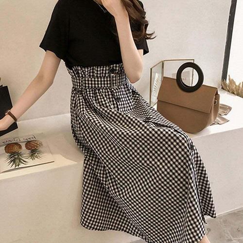 [셀럽하우스]데일리 EAZX4872 여성 여름 블랙 반팔 체크 스커트 투피스 세트