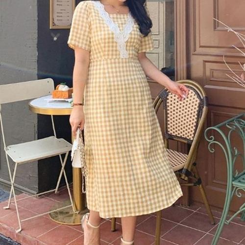 [엄지척]여자 봄 여름 빅사이즈 노란색 체크 반팔 롱원피스_19913271_667501