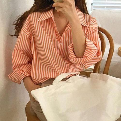 [셀러허브_여성트랜드패션]여성 스트라이프 루즈핏 셔츠 남방 줄무늬 여름 2color 코디