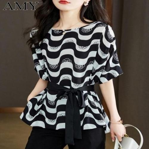 여성 루즈핏 여름 라운드넥 반팔 패턴 블라우스 블루