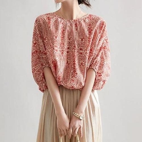 [엄지척]여성 루즈핏 여름 라운드넥 반팔 패턴 블라우스 레드_19646061_667501