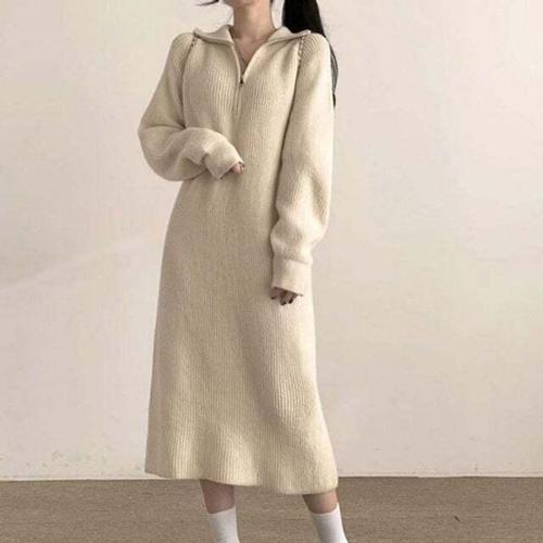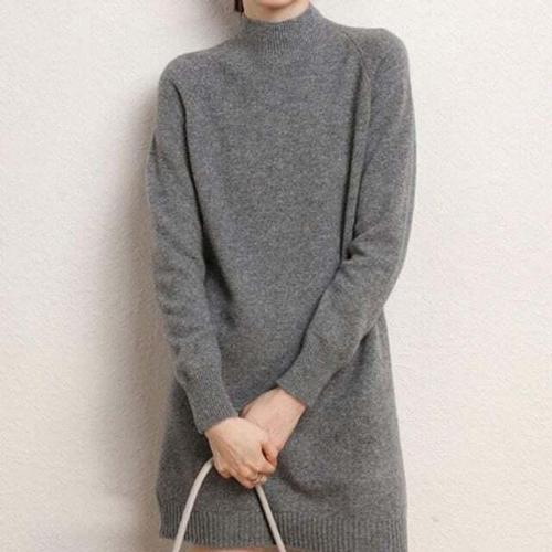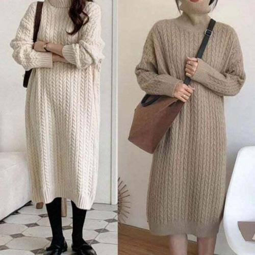 TKX 여성용 고급스러운 니트 원피스 가을 겨울 긴소매 플라워 장식 반하이넥 무지 기본핏 오피스룩 K67
