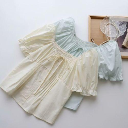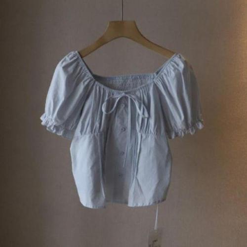 [신상오픈런]여성용 여름 리본 장식 퍼프 소매 크롭 블라우스