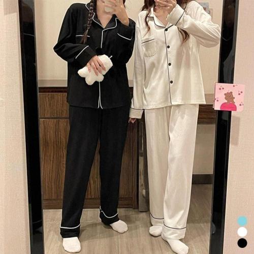 [옷자락]여성 여름 홈웨어 셔츠 스타일 두께 잠옷 상하 세트