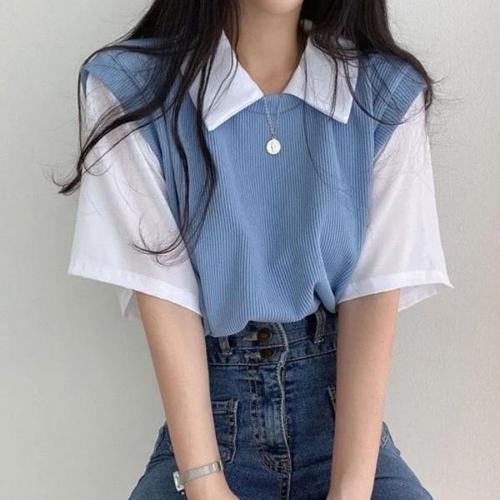 [엄지척]여성 여름 페이크 레이어드 티셔츠 골지 조끼 반팔티_19613408_667501