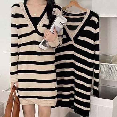 [모노무드]모노무드 xmfl-2 여성 여름 원피스 니트 펀칭 배색 단가라 패턴