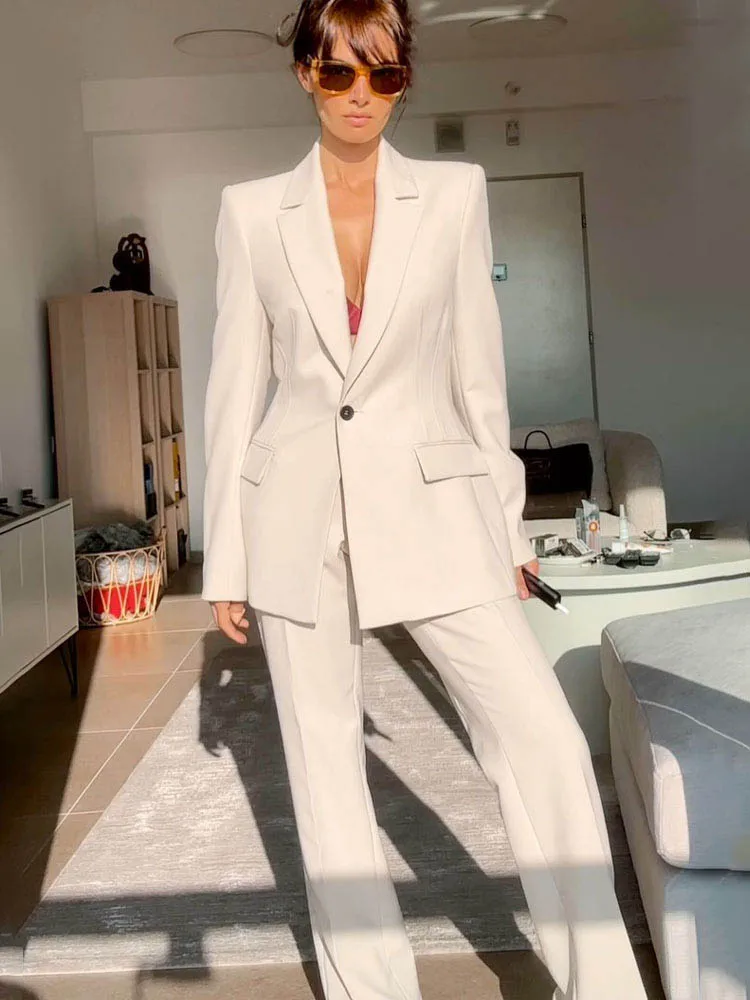 여성용 블레이저 수트 패션 긴 소매 라펠 원 버클 장식 수트 재킷+우아한 사이드 포켓 지퍼 캐주얼 바지