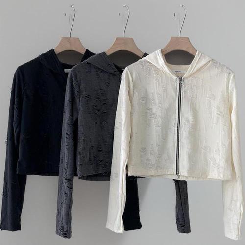 [신상오픈런]여성 데미지 크롭 후드 롱슬리브 집업