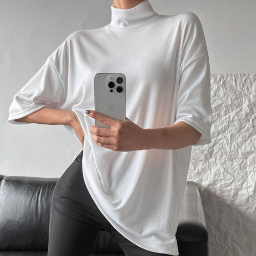 옷자락 / 여자 겨울 목폴라 후라이스 루즈 오버핏 반팔 티셔츠