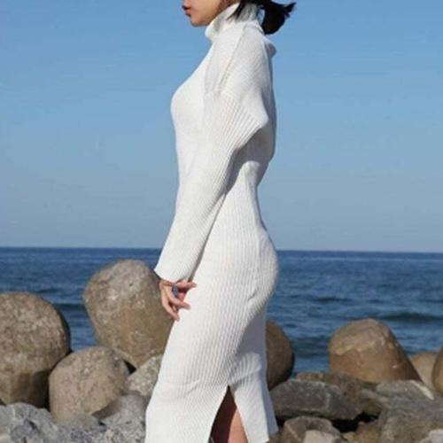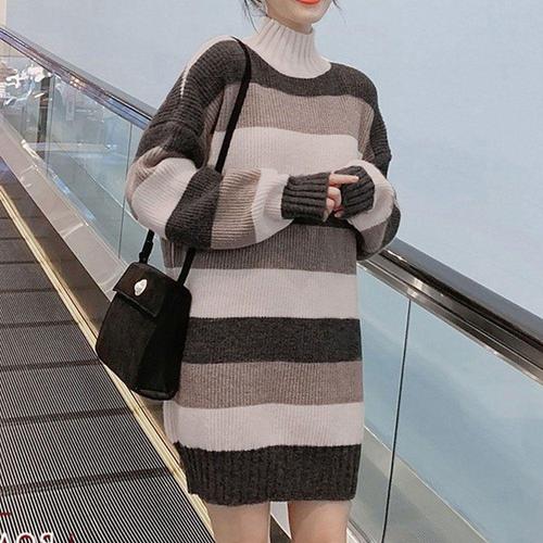 [셀럽하우스]배색 IPMF6245 목폴라 니트 롱 원피스 캐주얼 루즈핏