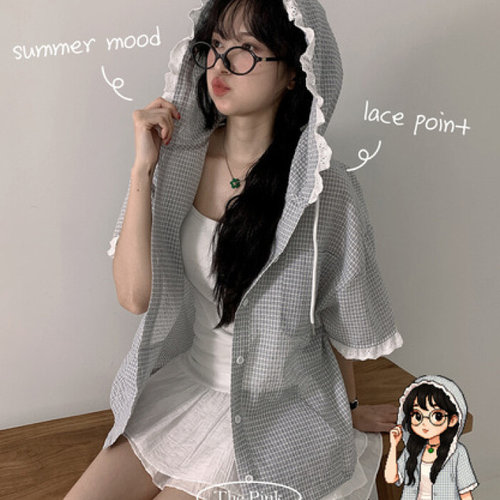 더핑크 / 뮤니 체크 레이스 스트링 후드 반팔 셔츠