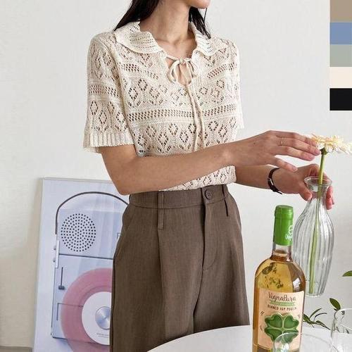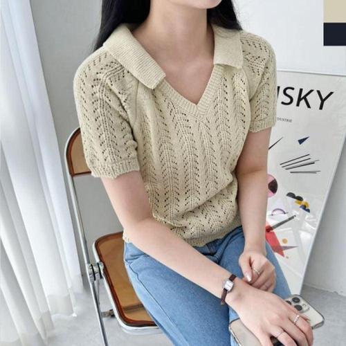 잇진 여성 시원해요 오픈 카라 반팔 니트 티셔츠