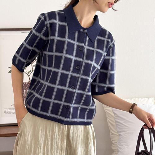 [다잇템]여자 베이직핏 카라넥 반소매 격자 니트