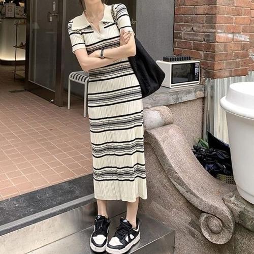 [엄지척]슬림핏 여성 스트라이프 카라 니트 반팔 롱원피스_19871092_667501