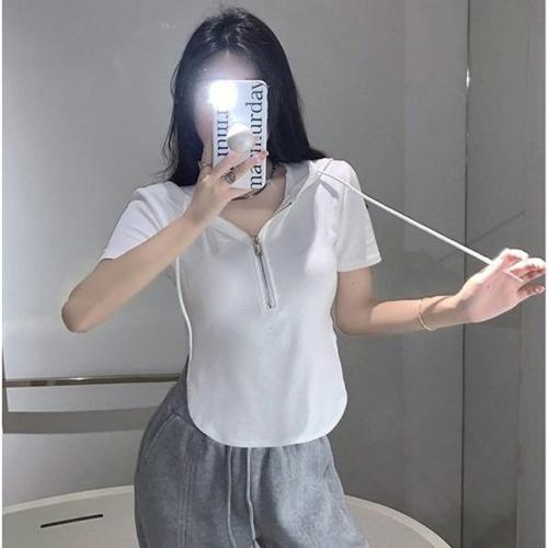 [엄지척]여성 옆트임 스트릿 반집업 캐주얼 반팔 후드 티셔츠_19609545_667501