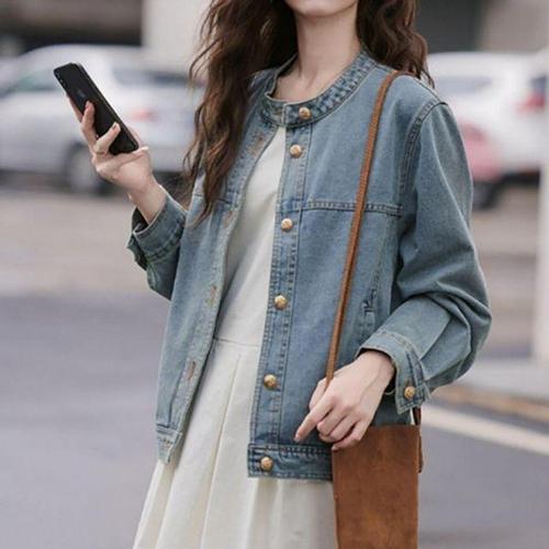 스트리트 캐주얼 루즈 버튼 스플릿 짧은 데님 자켓 여성 패션 봄 가을 2025 스탠드 칼라 긴 소매 진 자켓