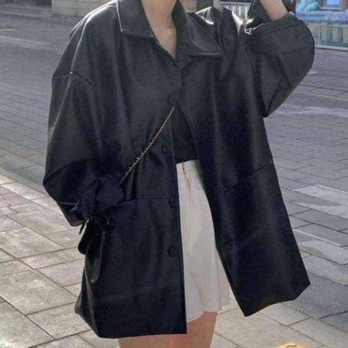 KONDALA 캐주얼 시크 블랙 가죽 재킷 여성용 긴 소매 버튼 탄력 있는 오버사이즈 코트 패션 2026 봄 스트리트웨어 코트