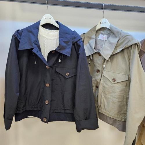[옷자락]여자 배색포켓 레이어드 셔링 후드 사파리 숏 점퍼