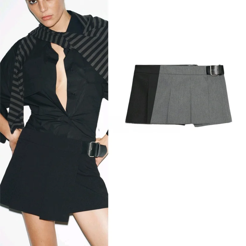 가을 신상 여성 심플 스타일 숏 웨이스트 벨티드 스커트 팬츠 디자인 와이드 플리츠 미니멀리스트 미학 폴리에스터 섬유