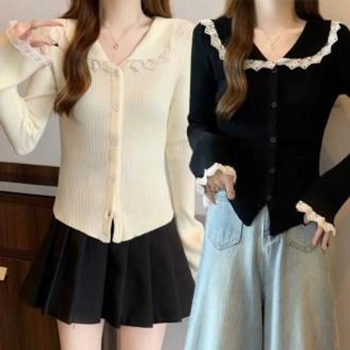 [기타브랜드]긴팔 얇은 레이스 카라 골지 여성스런 가디건 슬림핏 가을 핏니트 핏카디건 기본 티셔츠