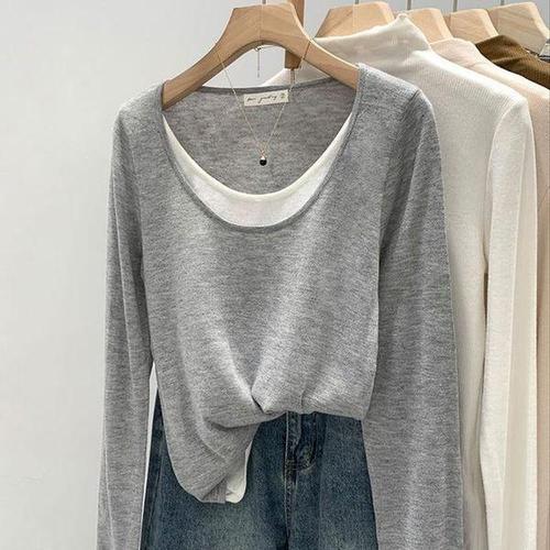 [셀러허브_여성트랜드패션]ONM 여성 레이어드 U넥 티셔츠 얇은 긴팔티 자외선