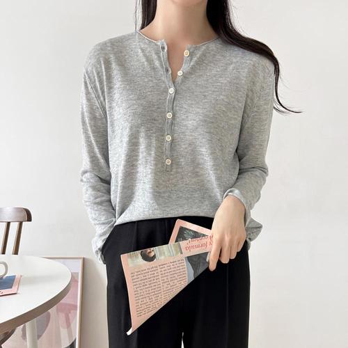 샵앤) 여성 라운드 반오픈 단추 얇은 무지 긴팔 니트티 NYS-WKN-4797-연그레이