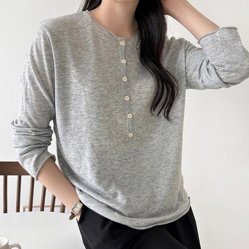 여성 라운드 반오픈 단추 얇은 무지 긴팔 니트티 NYS-WKN-4797-진그레이