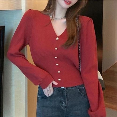 [엄지척]금색 단추 포인트 브이넥 여성 정장 니트티 어깨 퍼프_19659680_667501