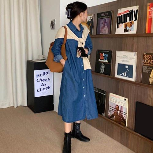[셀럽하우스]데님 PLTR1613 여성 남방 간절기 아우터 롱 청 셔츠 긴 원피스