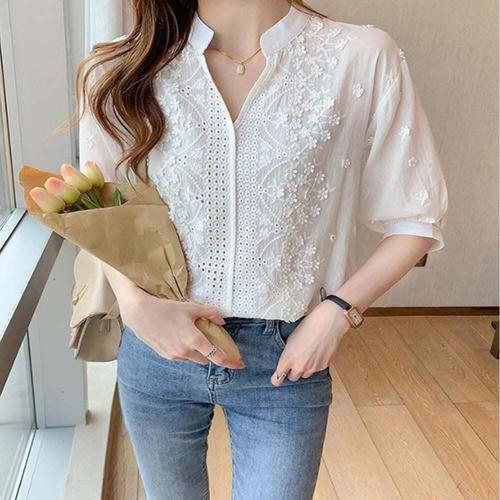 [셀럽하우스]플라워 PUUN8285 자수 펀칭 블라우스 브이넥 여름 페미닌 셔츠