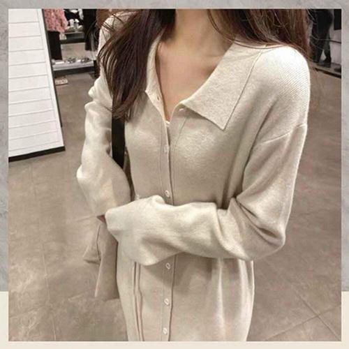 MINA STYLE 브이넥 원피스 니트 롱 옆트임 여성 긴팔 데일리룩