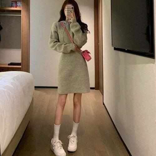 오스틱니[150kg까지 날씬해보이는] 원피스 여성 춘추 겨울 니트 무지 골지 브이넥 퍼프 이너 간절기 보송 스판 스웨터 단아한 매력 빅사이즈 캐주얼 패션 데일리 미디 a라인 스커트
