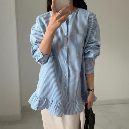 [옷자락]여성 러블리 스트라이프 오버핏 프릴 포켓 노카라 블라우스