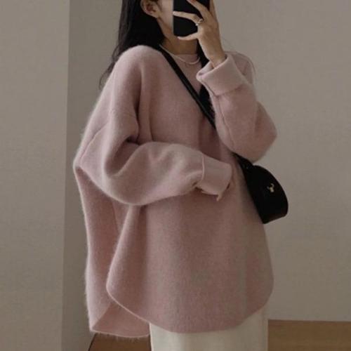 봄 가을 여성용 프렌치 스타일 오버핏따뜻한 니트 고급 허리 라인 루즈핏 라운드넥 니트 사의