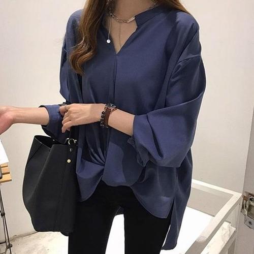 여성 깔끔한 카라 셔츠 긴팔 정장 오피스룩 루즈핏가을블라우스 브이넥 여자 오피스 면접 실크