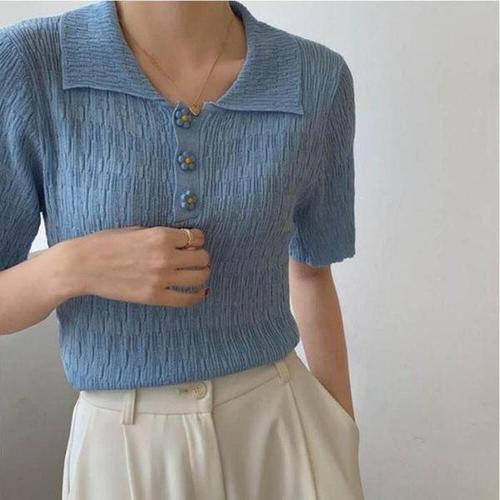 [셀러허브_여성트랜드패션]여성 디테일 은은한 단추 꽃모양 화사하고 반팔카라티